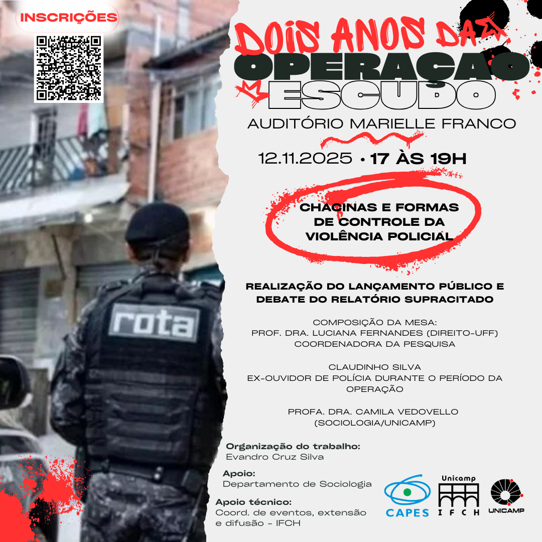 O IFCH Unicamp recebe no dia 12 de novembro duas atividades dedicadas à reflexão crítica sobre a violência policial no Brasil promovidas pelo Departamento de Sociologia. Os eventos integram a agenda de pesquisa e extensão do projeto Operação Escudo, que chega a dois anos de investigação sobre as dinâmicas e impactos da letalidade policial no estado de São Paulo.