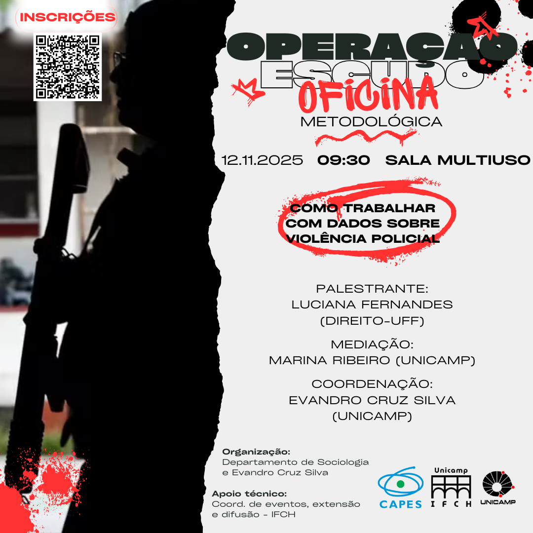 A programação se inicia às 9h30, na Sala Multiuso do IFCH, com a Oficina Metodológica “Como trabalhar com dados sobre violência policial”, ministrada por Luciana Fernandes, professora de Direito da Universidade Federal Fluminense (UFF). A atividade tem mediação de Marina Ribeiro (Unicamp) e coordenação de Evandro Cruz Silva (Unicamp), e propõe discutir os desafios metodológicos, éticos e políticos envolvidos na coleta e análise de informações sobre ações policiais, especialmente em contextos marcados por chacinas e operações de alta letalidade.