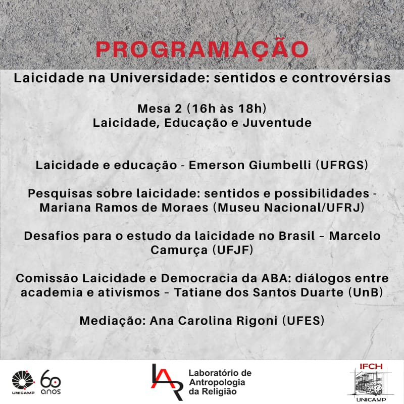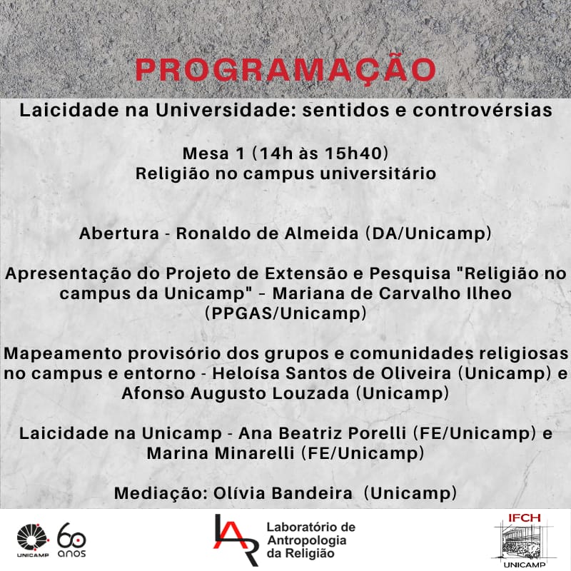 O Laboratório de Antropologia da Religião, do Instituto de Filosofia e Ciências Humanas, convida a comunidade acadêmica da Unicamp e a comunidade externa para participarem do Seminário do LAR, com o tema "Laicidade na Universidade: sentidos e controvérsias". Organizado por Mariana de Carvalho Ilheo (PPGAS/Unicamp) e Olívia Bandeira (Unicamp), a atividade acontecerá de forma remota no dia 27 de novembro das 14h às 18h, contando com duas mesas. Haverá certificação para as pessoas inscritas.
